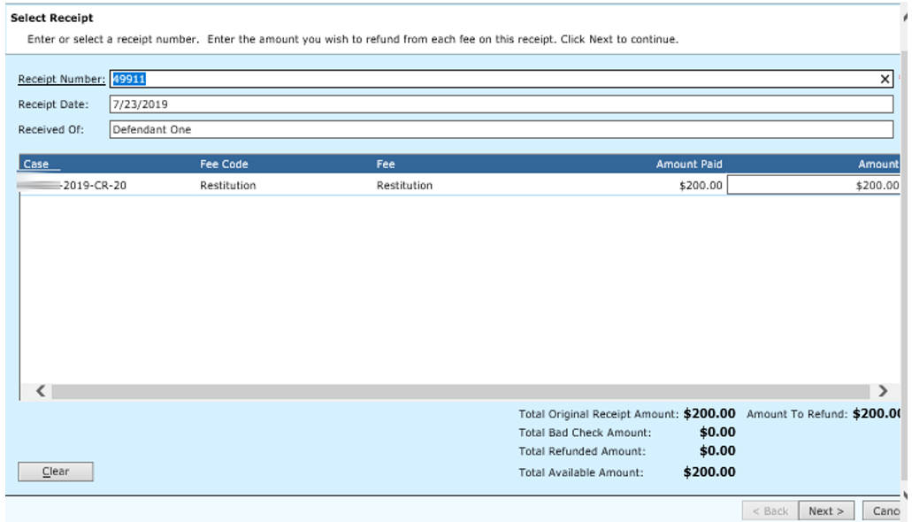 Enter the receipt number to be selected for the refund. You can use the Receipt Number hyperlink to select from receipts currently on file. When you have entered/selected a receipt, the receipt information will be displayed. On each transaction line shown, enter the amount to be refunded. If you need to clear the refund amounts you have entered, you can click the Clear button. When the refund amounts are correct; click the Next > button to proceed. To cancel the process and return to the main menu, click the Cancel button.