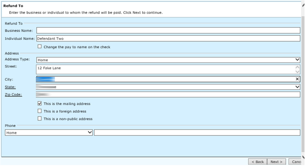 Enter the information about who will receive the refund. The default information (from the receipt) will be automatically entered, but changes can be made if necessary. When all information has been entered, click the Next > button to proceed. Click the <Back button to return to the previous screens if changes need to be made. To cancel the process and return to the main menu, click the Cancel button.