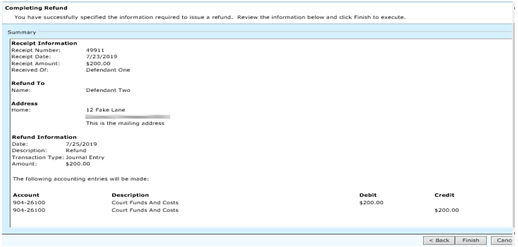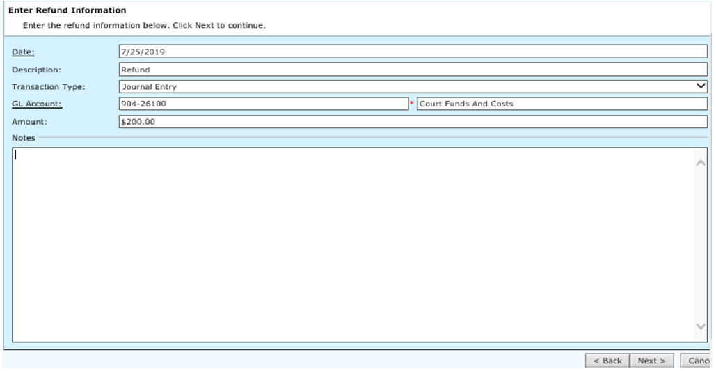 Enter the information for the refund. Some information will be automatically entered into the fields, but it can be changed if necessary. When the information is complete, click the Next > button to proceed. Click the <Back> button to return to the previous screens if changes need to be made. To cancel the process and return to the main menu, click the Cancel button.