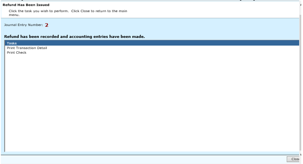When the files have been updated, this screen will be displayed. Click the Close button to return to the main menu. If you want to print the refund check now, click the task for Print Check. Follow the instructions as prompted.