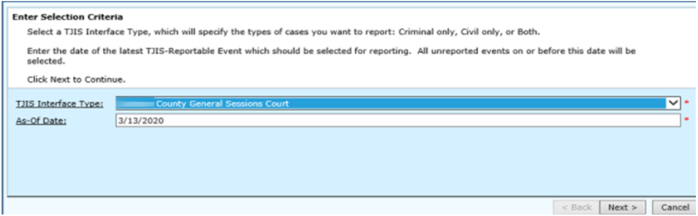Select an As-Of Date. Note: The As-Of Date chosen indicates the date of the latest TJIS Reportable Event to be selected.
