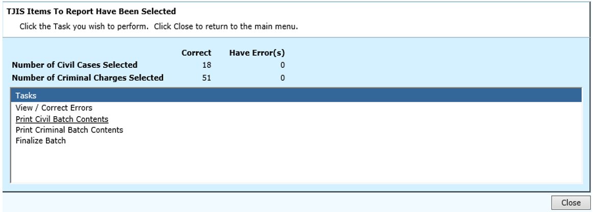 TJIS compiles information from across the state, and produces statistical reports based on the information gathered. This interface allows you to select both Civil and Criminal cases (depending upon the interface type setup), and a date range within which to report cases. You will have functionality to view/correct errors prior to sending the batch file. After reviewing the batch file, you will be able to send it to the AOC. Any corrections for TJIS reporting after the file is sent will still be done manually.