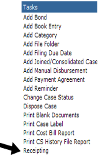 Once you find the case you wish to process, go into that case, and click the “Receipting” tasks from the tasks list.
