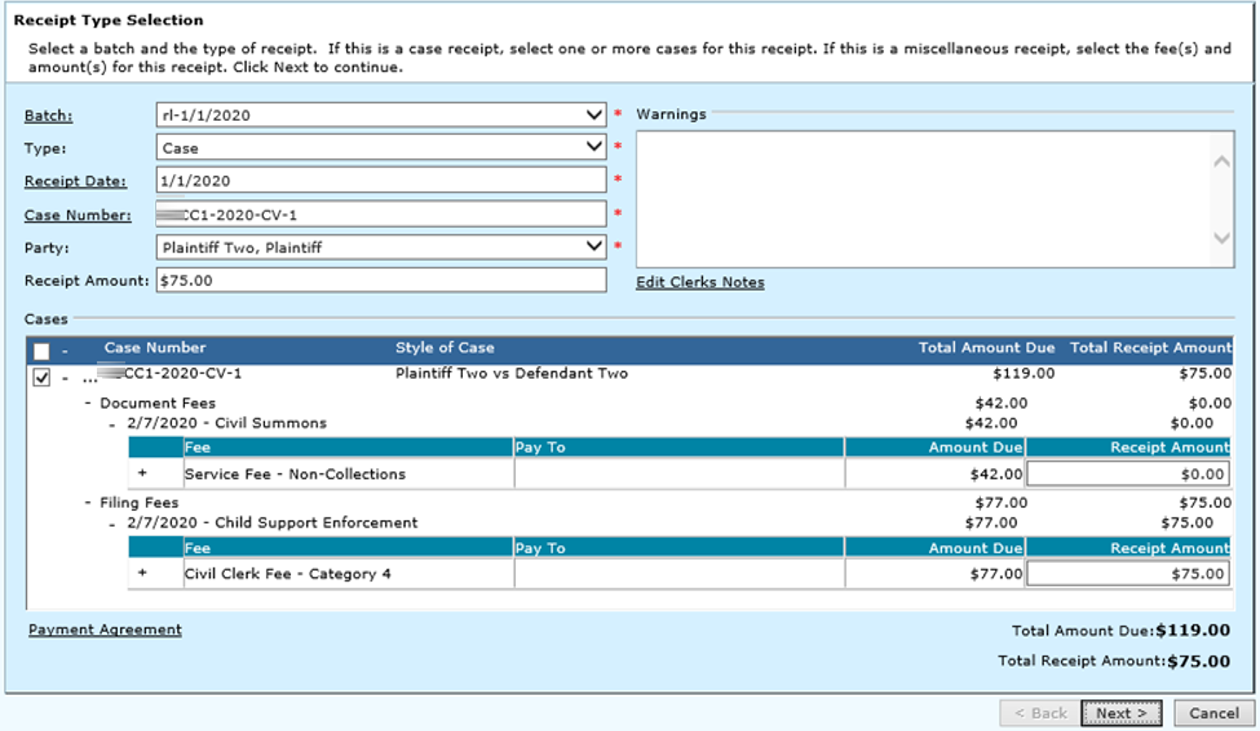 Once you have receipted money, return to the case general screen (see right)