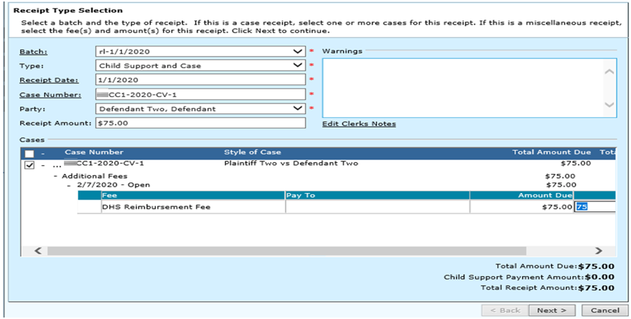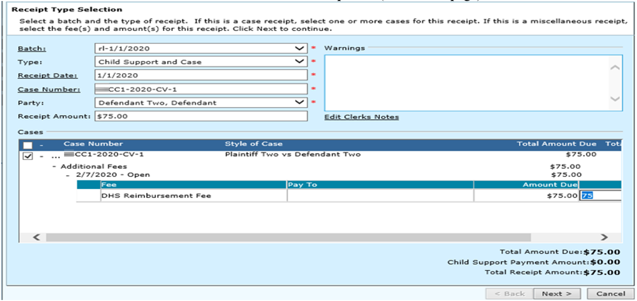 Do not select a party for the ‘select parties to refund cost’ drop down. The DHS reimbursement fee is already applied against the defendant.