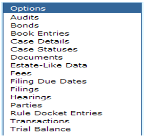From a civil case, click on Filing Due Dates from the Options menu. The Filing Due Dates screen will appear. The Case Number, Style of Case, and Filings will