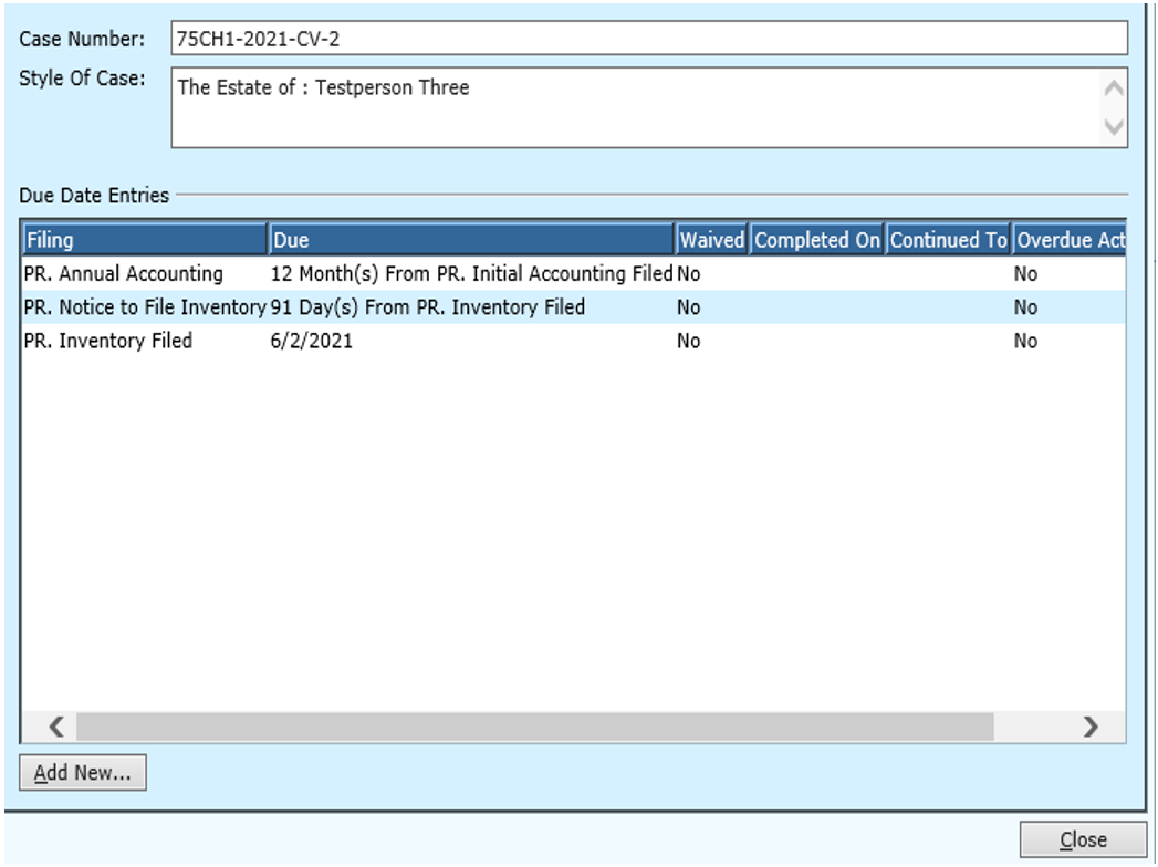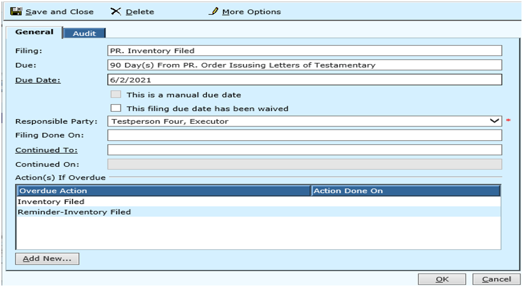 After a Civil Case has been added, an Overdue Action can be viewed or added through Options, Filing Due Dates. All filings will be listed and can be edited from this screen. New filings and Overdue Actions can also be added from here.