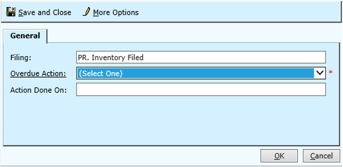 | Overdue Action | Required | Select the Overdue Action for the filing from the drop down menu options. Click on the Overdue Action hyperlink to add or edit Overdue Actions. |
