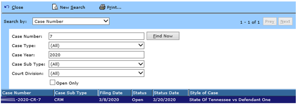 Using the drop down menu for the Search by field, you can select to search by Case Number (this is the default), Citation Number, Party, Attorney, Officer, Judge, Status, Filing Date, Reference Number, Last Name, or Sentence Deferred. You can also select the cases that are Open Only. Based on how you will search, you will enter the appropriate search criteria. Make the appropriate entries/selections. When the criteria have been selected, click the Find Now button. The cases will be displayed. Double click on the appropriate case to select.