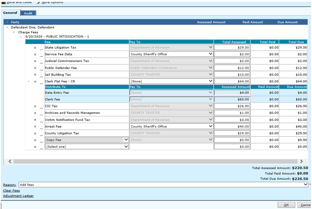 Use the drop down menu to select a reason for the added fee. You may use the Reason hyperlink to Add New or Edit a reason. If ‘Other’ is selected, the ‘Other Reason’ field appears allowing the clerk to enter all information necessary, concerning the change. Then click the OK button at the bottom of the screen or Save and Close to return to Step 3.