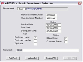 Select Billing Records – the following screen will appear. F2 to select the department, if all customers will be selected enter through the customer numbers. If there is a range of customers to be printed key in the range of numbers. Key in the invoice date, due date, & delinquent date. Select the method of sorting for the bills. Select the bill code & customer status by using the F2 lookup. Last key in a comment if needed.
